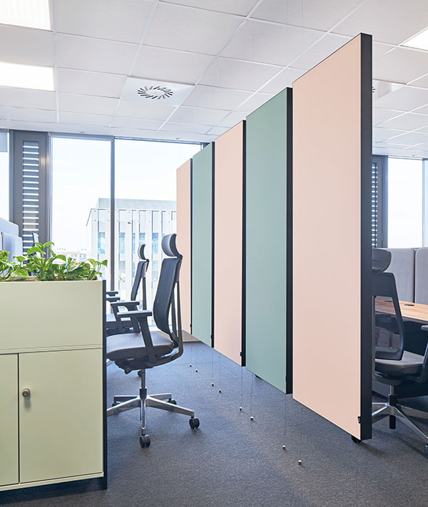Riippuvia akustiikkaelementtejä voidaan käyttää myös tilanjakajina”,