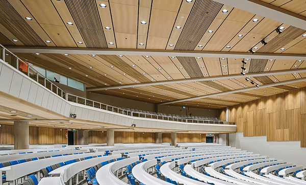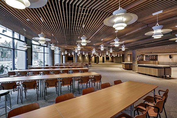 puulamellipintaisia elementtejä, jotka tuovat tilaan lisää vaimennuspintaalaa.