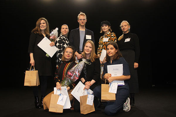 Etualalla ehdotus KUMUn tekijät Veera Saastamoinen (vas.), Venla Kotilainen ja Anni Jäntti. Takarivissä kunniamaininnan saaneen METSÄN REUNASSA toinen tekijöistä Rosaliina Järvinen (vas.).