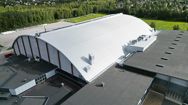 Tämä tamperelainen monitoimikeskus on rakennettu vuonna 1985, ja yksi sen rakennuksista tarvitsi uuden katon. Vesikatteen vaihto oli vaativa urakka, koska rakennus oli laajarunkoinen puukaarihalli, jonka reunat ovat erittäin jyrkkiä. Työ oli tehtävä vaiheittain poistaen vesikatteesta pieniä alueita kerrallaan korvaten ne välittömästi RENOLIT ALKORPLAN F -vesikatteella.
