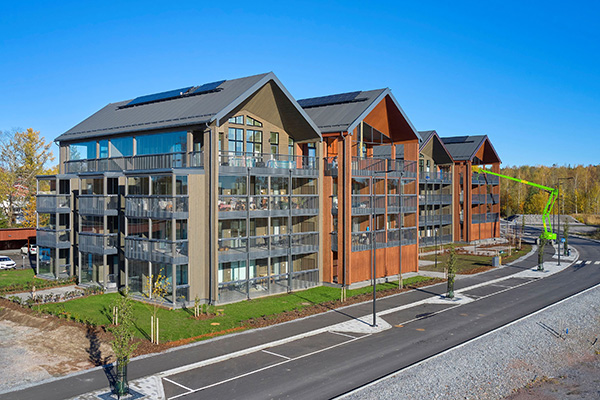 Inkooseen valmistuneet hirsikerrostalot ovat nelikerroksisia hissillisiä kerrostaloja. Seinärakenne on toteutettu 240 mm vahvuisella kuusen lamellihirrellä. Arkkitehtisuunnittelu Aki Hiltunen, Osuma Arkkitehdit Oy. Kuva: Honkatalot / Hans Koistinen