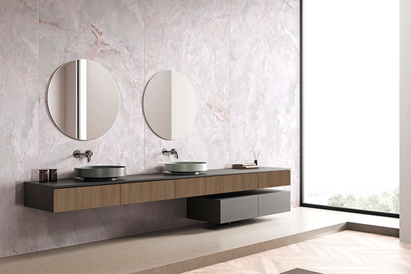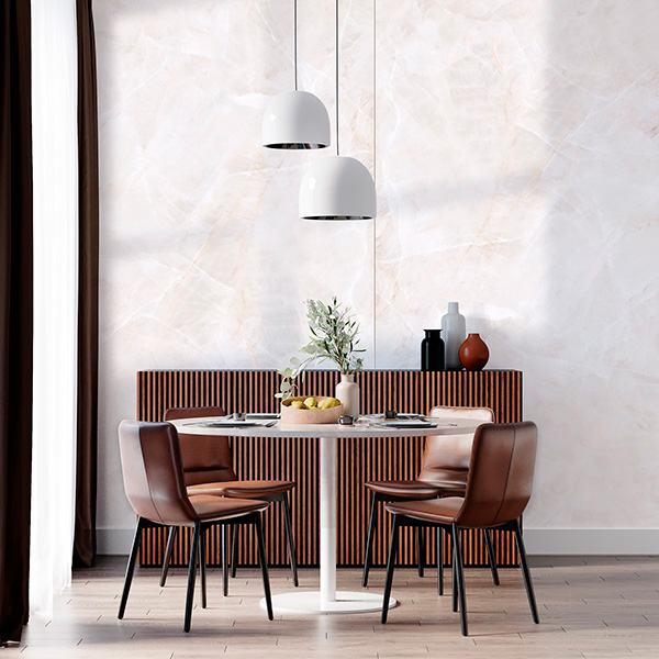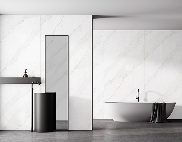 Suurikokoisilla Rocko Wall Tiles -seinälevyillä voidaan toteuttaa huonekorkeudeltaan yhtenäistä pintaa vain muutamilla pystysaumoilla, joten levyillä voidaan luoda vaikutelma suurilla marmori- tai kivilaatoilla verhoillusta seinästä.