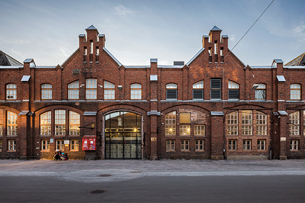 Vanhan konepaja-alueen rakennukset ovat suuria ja sisätilat ovat avaria.