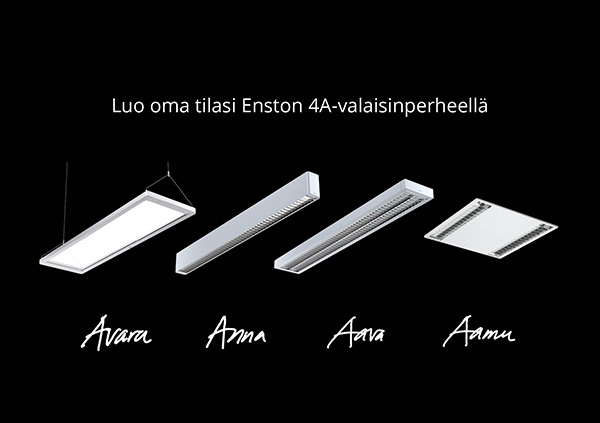 Ensto lanseeraa uuden valaisinperheen, johon kuuluu neljä sisarusta Anna, Aava, Avara ja Aamu. Sisaruksia yhdistää laadukas valo, yhtenäinen muotokieli ja tyylikäs ulkonäkö. 4A-valaisinperheellä luot juuri niin täydellisen valaistuksen kuin haluat – tilan luonteeseen sopien.