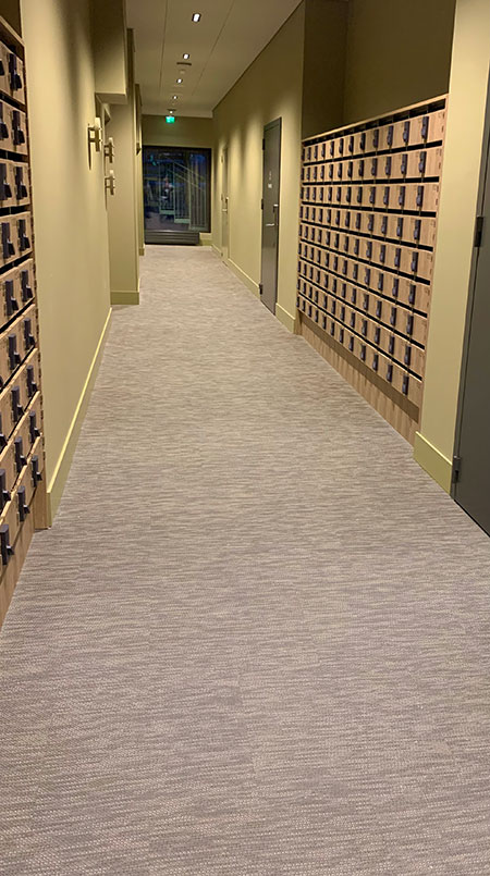 sekä hissi- ja porrashuoneen lasijulkisivun että studioiden suurten