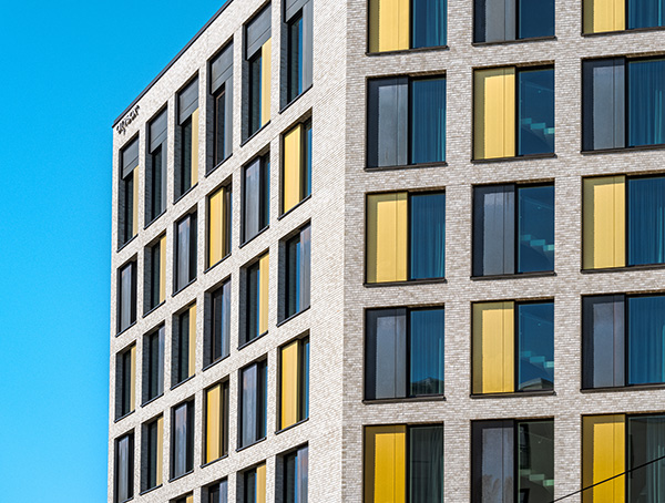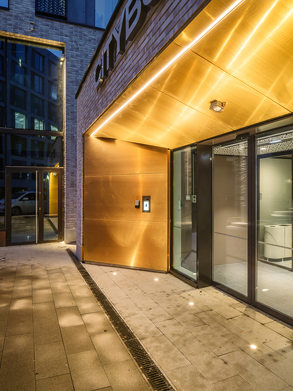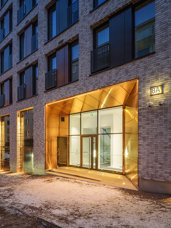 ”Julkisivuun on Aurubiksen valmistamilla kuparituotteilla toteutettu yhtenäiset ikkunanpielet. Tähän on tarvittu poikkeuksellisen suurikokoisia sileitä kuparipintoja.”
