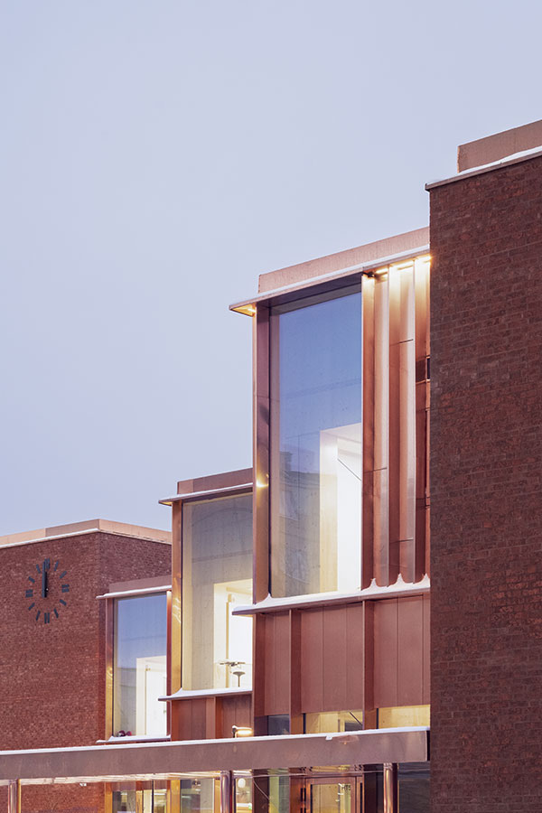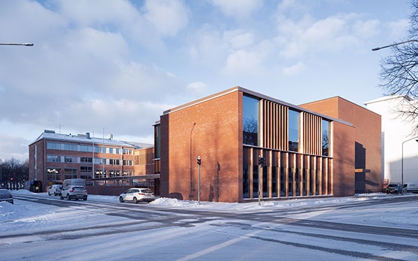 ”Halusimme luoda rakennukselle selkeän ulkohahmon, joka viestii arvokkuutta ja jatkuvuutta. Kampuksen perusparadigmana on pronssin ja punatiilin muodostama punertavan ruskea ulkohahmo, joka sisällä avautuu vaaleaan, puupintaiseen maailmaan” kertoo Miettinen.