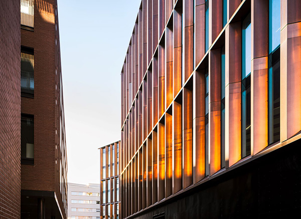 Uuden toimistotalon julkisivuissa on suuret ikkunat. Niiden ympärillä on kuparielementtejä, jotka on valmistettu kierrätetystä kuparista.