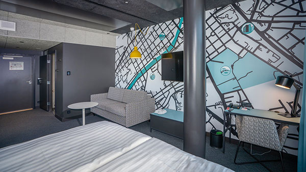 ”Hotellihuoneiden tapetit toteutimme sisustusarkkitehtitoimiston aineistojen pohjalta. Käytävätapettien visuaalisen ilmeen suunnittelimme ja toteutimme sisustusarkkitehtitoimiston toiveiden mukaisesti”, Raevuori sanoo.