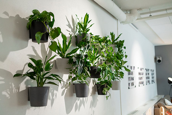 Istutuksiin valittiin valkoisia ja harmaita mattapintaisia Ecopots-ruukkuja, jotka on valmistettu kierrätysmuovista. CO2-neutraalien ruukkujen ajaton design ja luonnollinen ulkonäkö sopii erilaisiin sisustuksiin.
